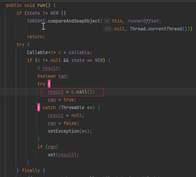 FutureTask类实现RunnableFuture接口,RunnableFuture接口实现Runnable接口;并且重写run方法,在run方法中调用了call方法。