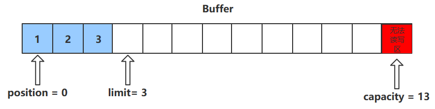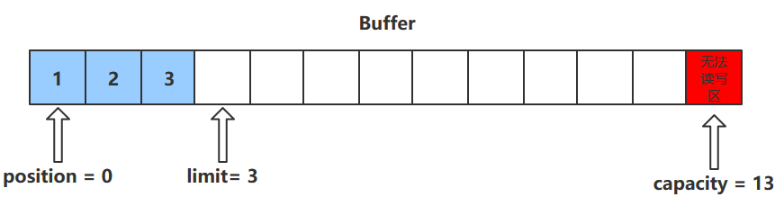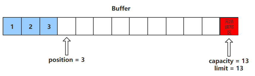 - 进行该操作后,postition的值会+1,指向下一个可以放入的位置。capacity = limit ,为缓冲区容量的值。