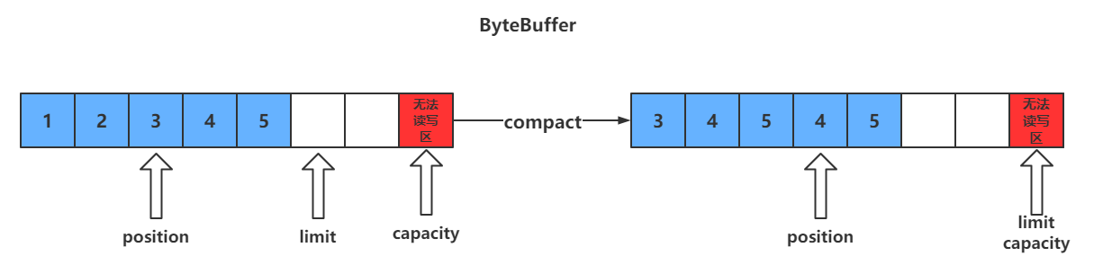 - 调用compact()方法时,会将缓冲区中的未读数据压缩到缓冲区前面