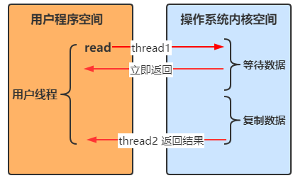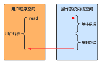 - 用户线程进行read操作时,需要等待操作系统执行实际的read操作,此期间用户线程是被阻塞的,无法执行其他操作