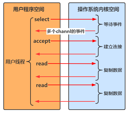 若事件未就绪,调用 selector 的 select() 方法会阻塞线程,直到 channel 发生了就绪事件。这些事件就绪后,select 方法就会返回这些事件交给 thread 来处理