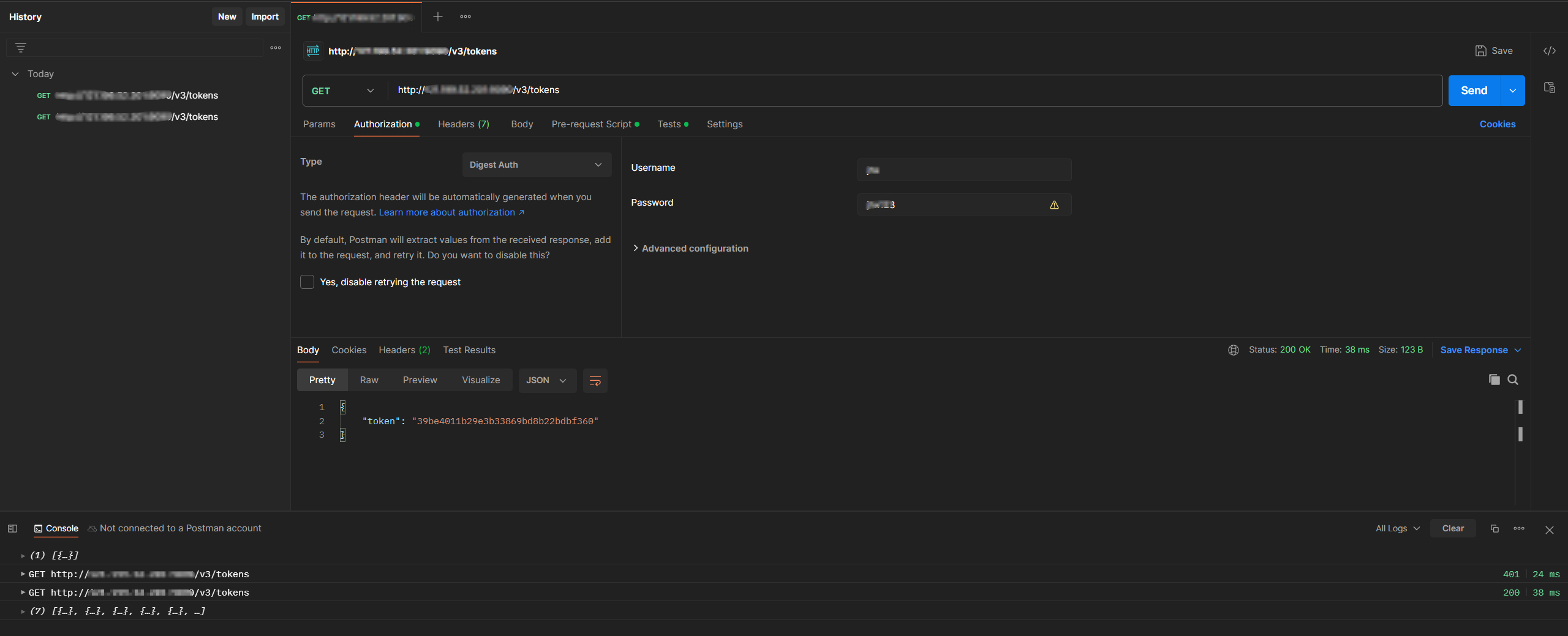 Authorization: Digest username="x", realm="xxx", nonce="10ba923b57a69919930000da2a75d34b", uri="/v3/tokens", algorithm="MD5", qop=auth, nc=00000001, cnonce="0W9VHP6H", response="e57c1968cb4bdd2b854b61a12d429f58"