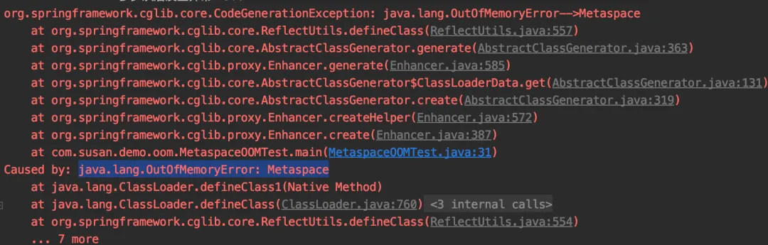程序最后会报java.lang.OutOfMemoryError: Metaspace的元空间OOM。