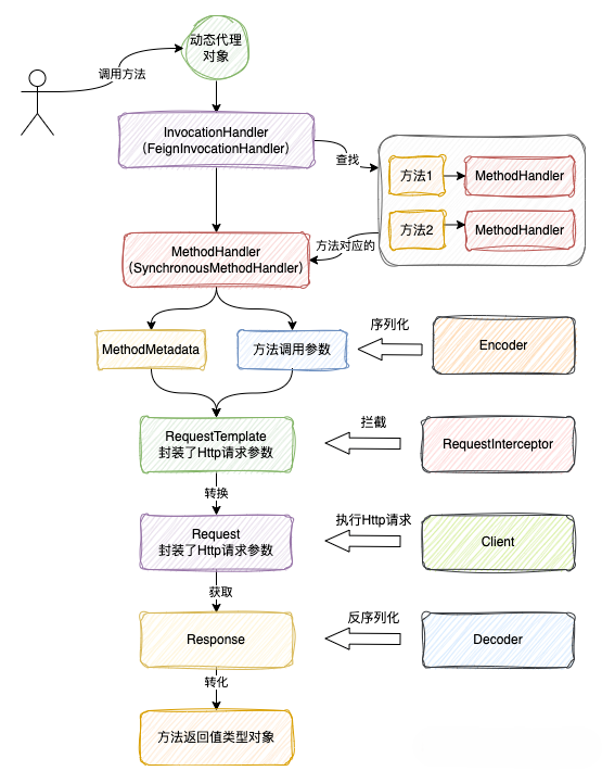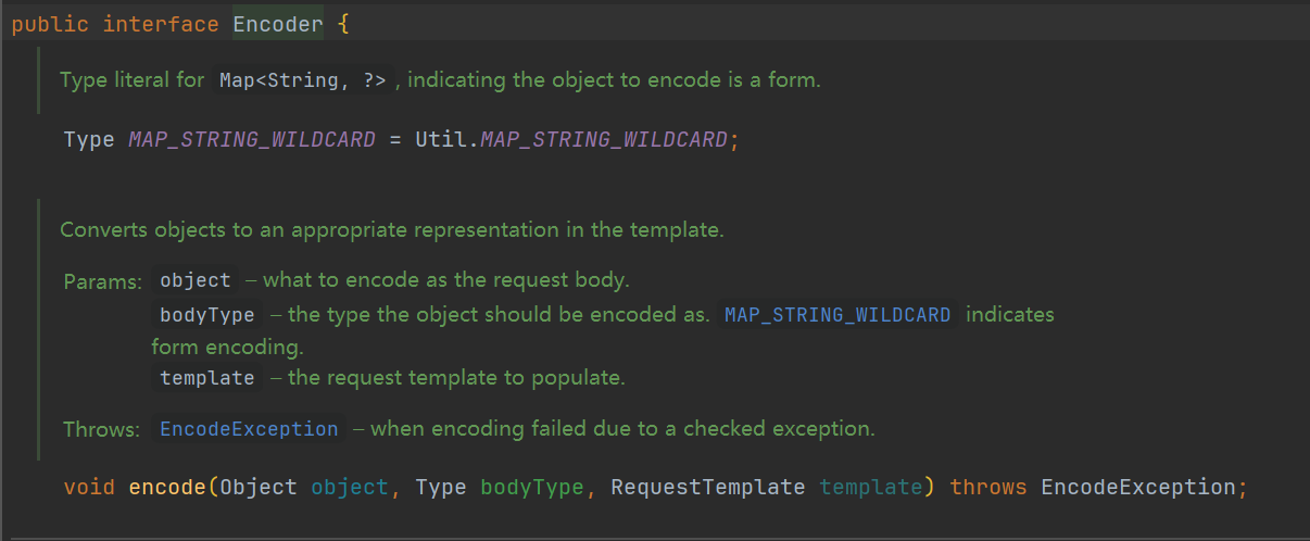 我们通常在请求数据需要进行加密传输的时候会使用到自定义编码器,我们需要对encode方法中的object进行加密处理,将加密后的数据设置到RequestTemplate中;这个过程等于我们把入参数据对象修改为了接口实际需要的参数对象。