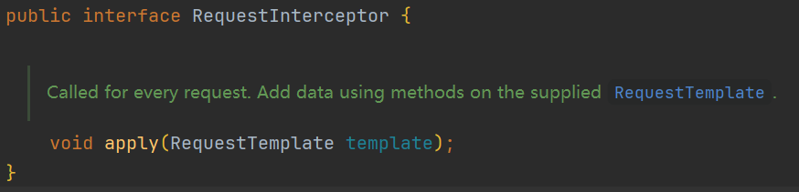 Openfeign请求拦截器,会在我们发送请求前执行apply(RequestTemplate template),RequestTemplate封装的则是我们的请求数据: