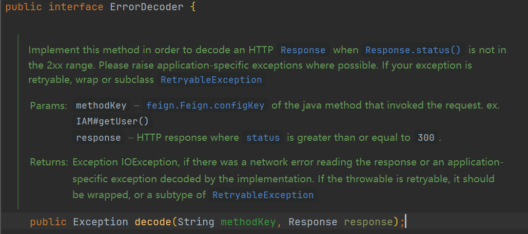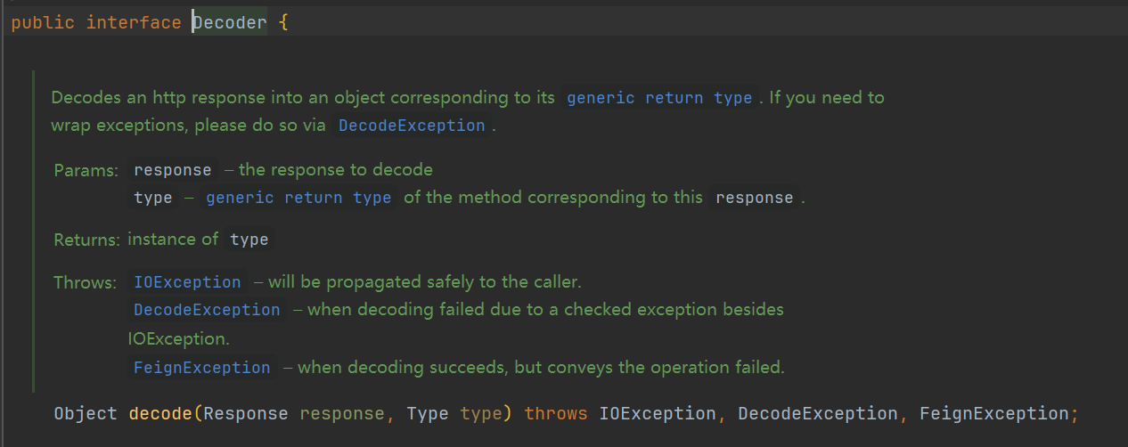 }我们在对响应数据进行特殊处理的时候会自定义解码器,如响应数据解密,响应数据格式转换等;只有接口反正状态码是200才会执行解码器里面的方法,如果返回状态码是4xx、5xx不会执行解码器,而是执行ErrorDecoder解码方法。