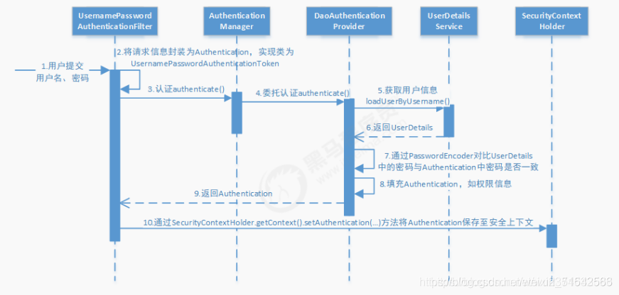 UsernamePasswordAuthenticationToken,并交给AuthenticationManager进行认证处理; AuthenticationManager会调用AuthenticationProvider进行数据的一致性校验;AuthenticationProvider会调用UserDetailsService的loadUserByUsername()方法获取真实数据UserDetails;AuthenticationProvider会将UsernamePasswordAuthenticationToken跟UserDetails进行数据一致性检验,并且添加权限;- 校验通过会返回