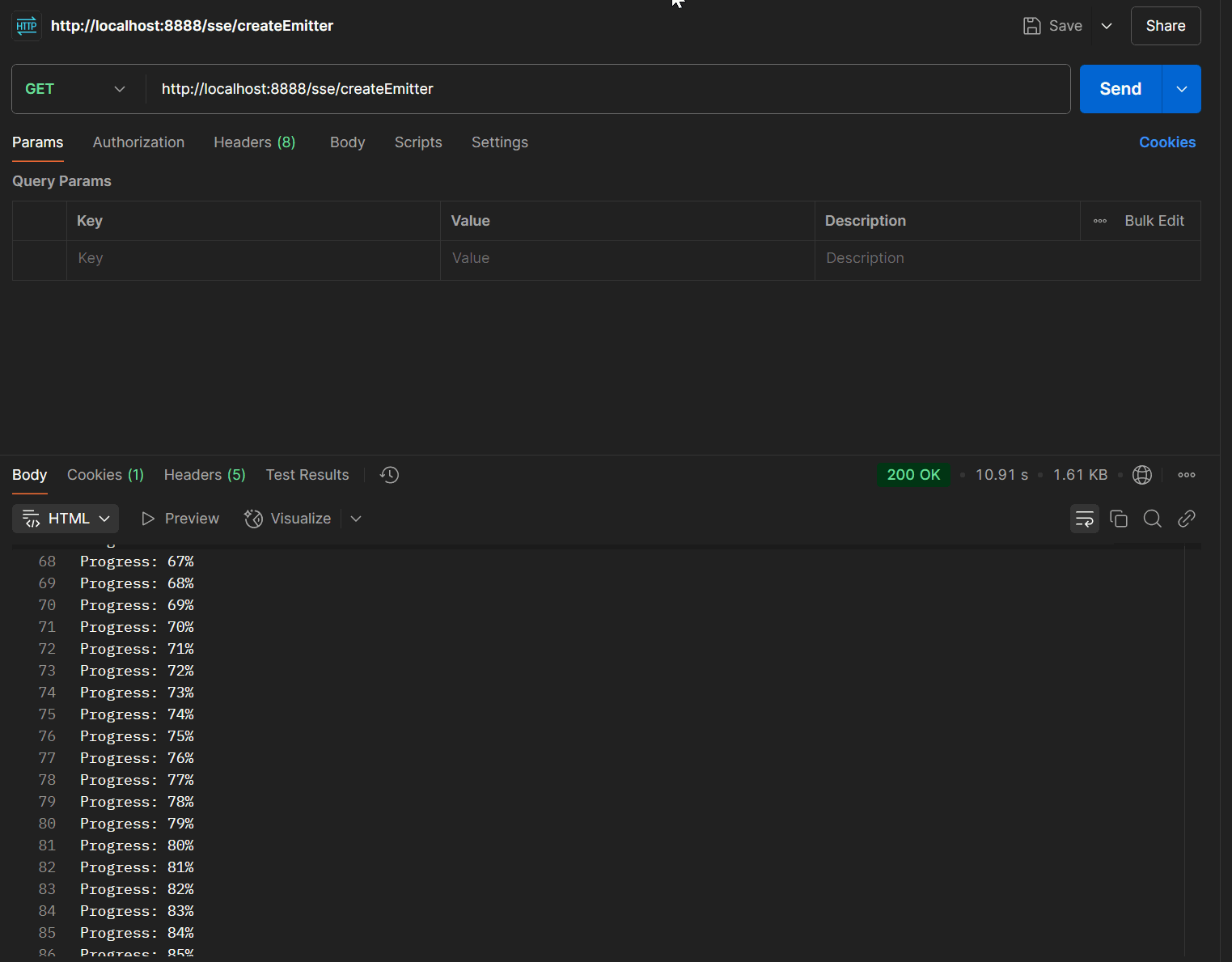 emitter.send("Progress: " + i + "%\n", MediaType.TEXT_HTML);