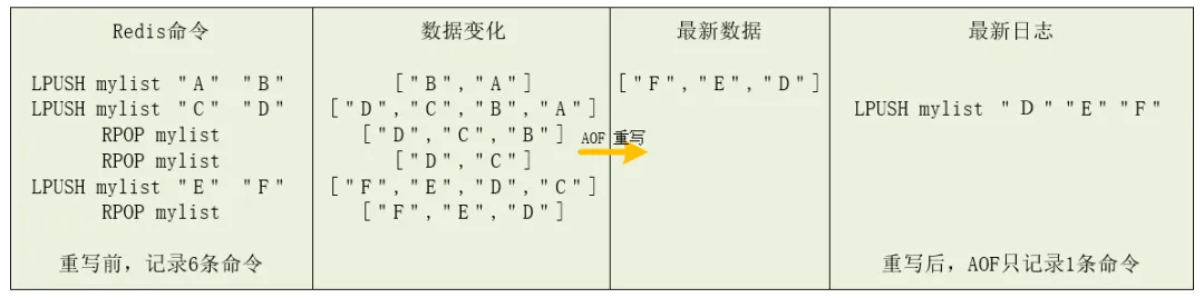这样,当需要恢复时,可以重新执行该命令,实现 “testkey”: “value” 的写入,而并不关心中间对这个 key 的其他写操作。以下图为例,当我们对一个列表先后做了 6 次修改操作后,列表的最后状态是 [“D”, “E”, “F”],此时,只用 LPUSH mylist “D”, “E”, “F” 这一条命令就能实现该数据的恢复,这就节省了五条命令的空间。这样对于被频繁修改过的键值对来说,重写能节省大量的空间。