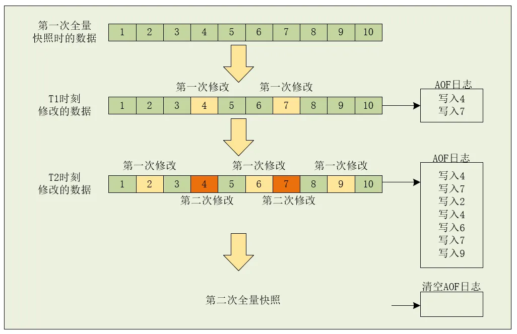 利用 AOF 日志记录两次快照间的操作,因此, AOF 文件也不会太大,也可以避免重写开销。如下图所示,T1 和 T2 时刻的修改,用 AOF 日志记录,等到第二次做全量快照时,就可以清空 AOF 日志,因为此时的修改都已经记录到快照中了,恢复时就不再用日志了。