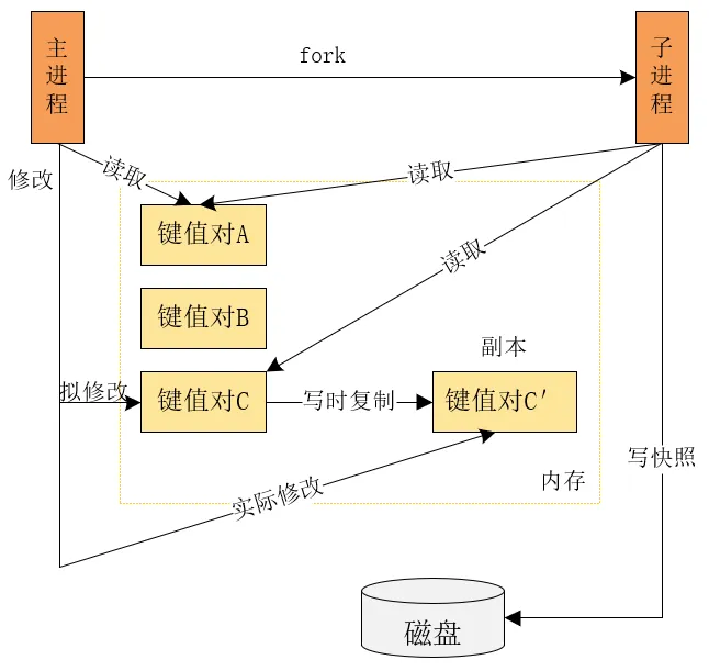 此时,如果主线程对这些数据也都是读操作(例如图中的键值对 A),那么,主线程和 bgsave 子进程相互不影响。但是,如果主线程要修改一块数据(例如图中的键值对 C),那么,这块数据就会被复制一份,生成该数据的副本(键值对 C’)。然后,主线程在这个数据副本上进行修改。同时,bgsave 子进程可以继续把原来的数据(键值对 C)写入 RDB 文件。这既保证了快照的完整性,也允许主线程同时对数据进行修改,避免了对正常业务的影响。