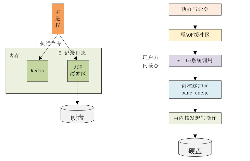 Redis 是先执行写操作命令,然后将该命令记录到 AOF 缓冲区中,最后再将缓冲区中的数据写入磁盘。这么做避免了额外的检查开销,不会阻塞当前写操作命令的执行。AOF 配置项 appendfsync 的参数值,为 AOF 日志写回磁盘的时机提供了三个选择。