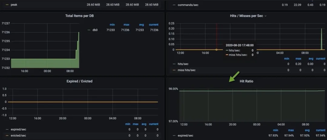 hit/(hit+miss) - 数据库连接池使用率:活跃连接数 vs 最大连接数