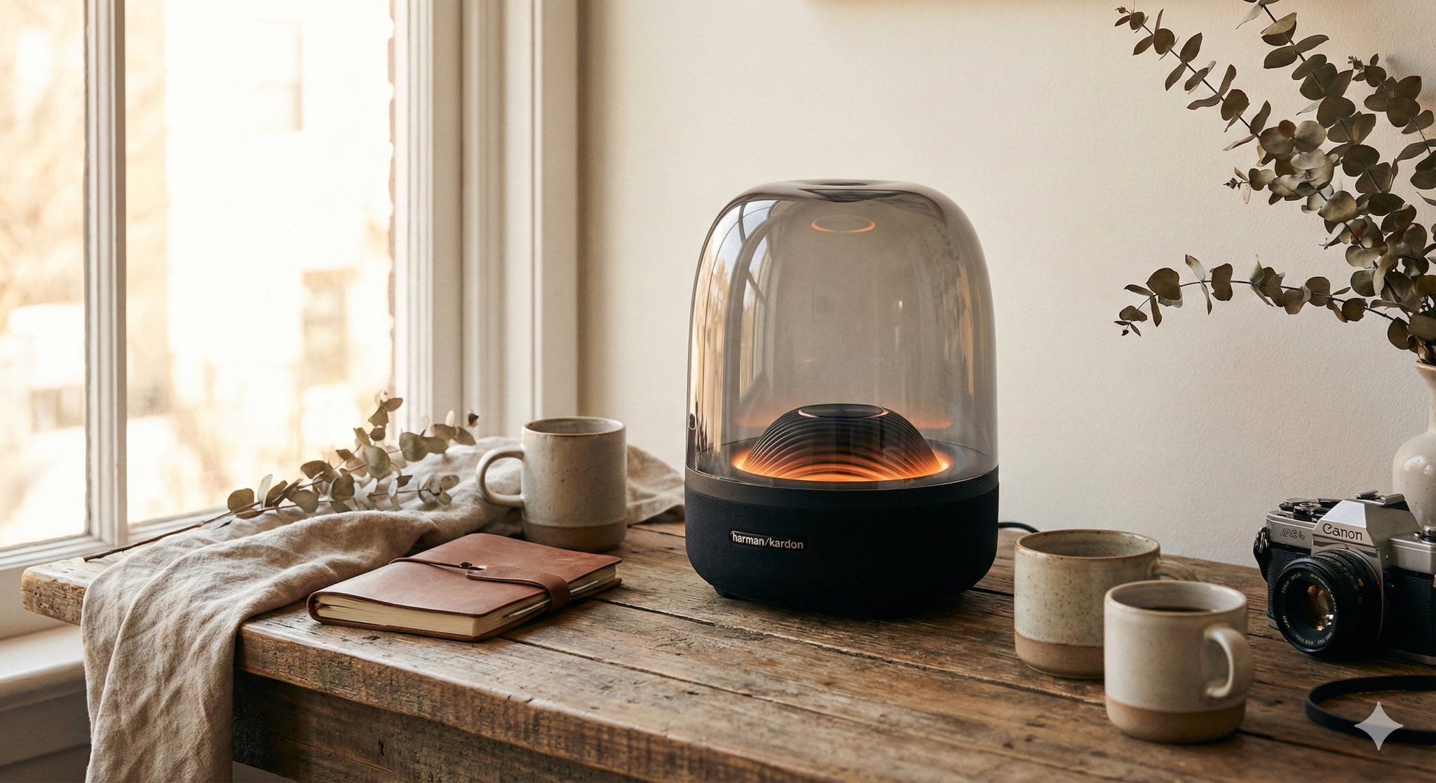 [品牌/产品名,比如哈曼卡顿琉璃3代音响] 的杂志照片,放置于地板/石头/木桌/丝绸上,周围环绕着 [生活方式道具]。