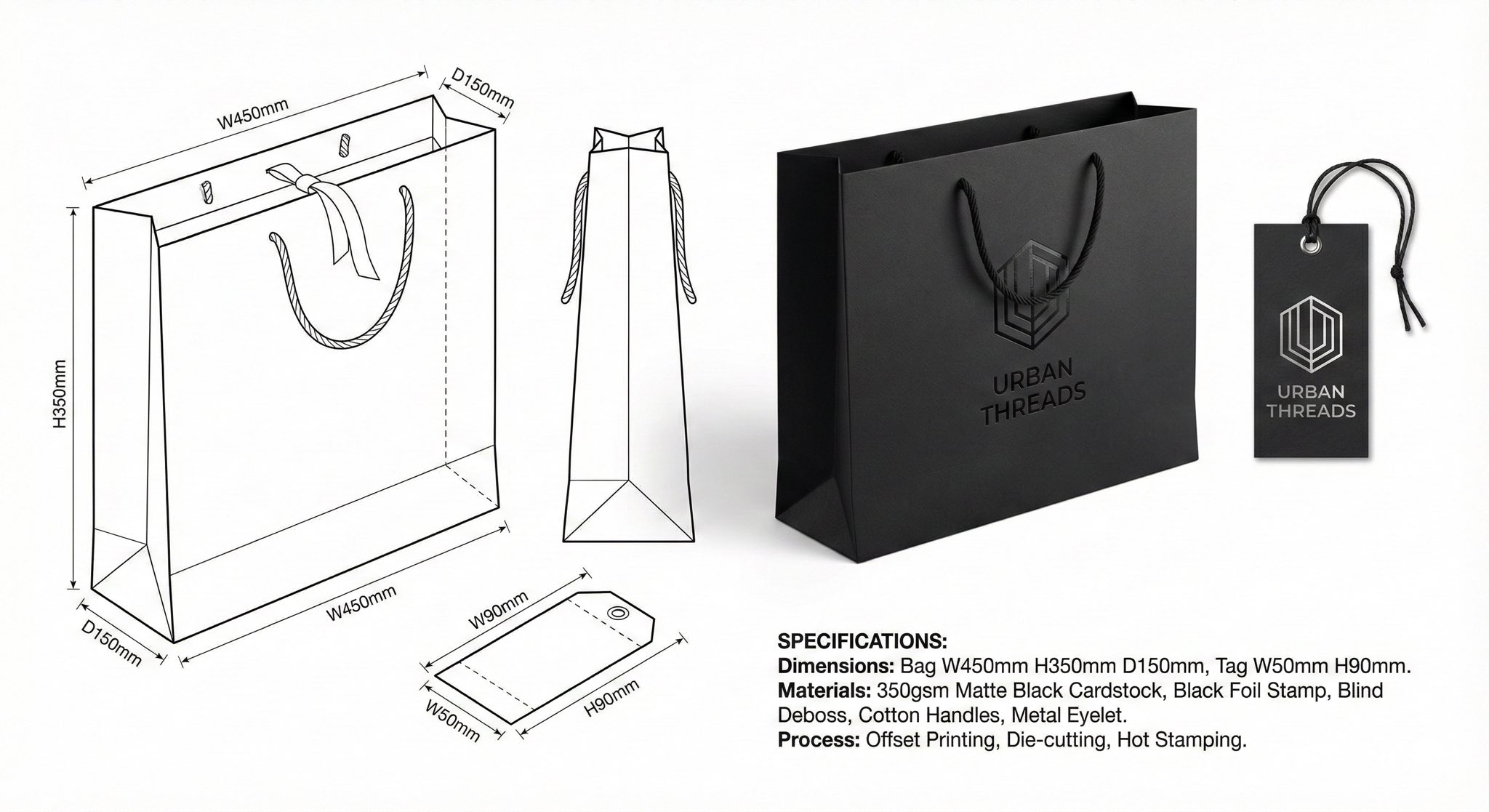 【服装/奶茶/面包】品牌包装设计展示图,一张完整设计稿画面,【总体风格描述,纯黑色包装袋,简约Logo设计,具有质感的材质………】,【需融入形象】……