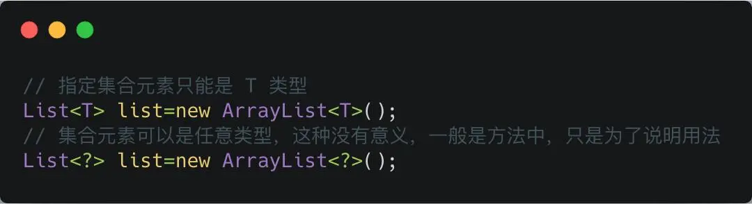 所以,对于不确定或者不关心实际要操作的类型,可以使用无限制通配符(尖括号里一个问号,即 <?> ),表示可以持有任何类型。像 countLegs 方法中,限定了上界,但是不关心具体类型是什么,所以对于传入的 Animal 的所有子类都可以支持,并且不会报错。而 countLegs1 就不行。