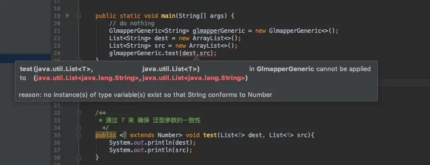 public void test(List<? extends Number> dest, List<? extends Number> src)像下面的代码中,约定的 T 是 Number 的子类才可以,但是申明时是用的 String ,所以就会飘红报错。