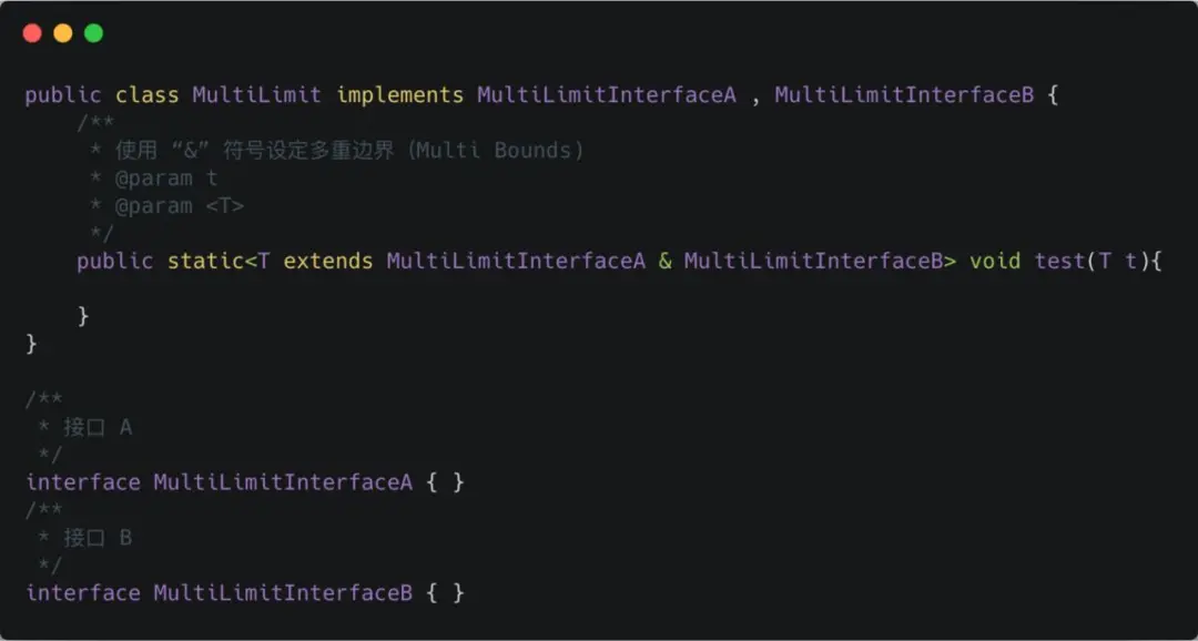 使用 & 符号设定多重边界(Multi Bounds),指定泛型类型 T 必须是 MultiLimitInterfaceA 和 MultiLimitInterfaceB 的共有子类型,此时变量 t 就具有了所有限定的方法和属性。对于通配符来说,因为它不是一个确定的类型,所以不能进行多重限定。